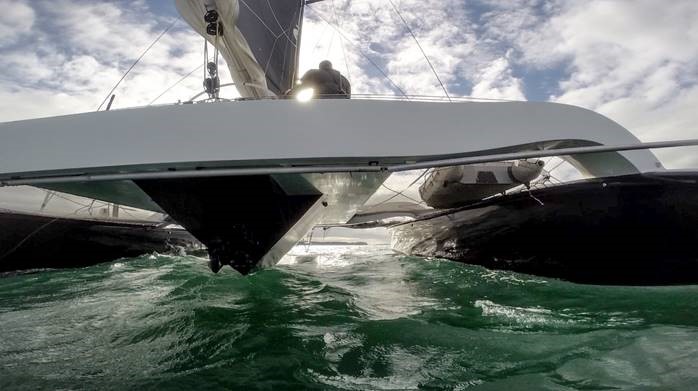 A feature of the hull design are the bulbs in the bows and the v section forward giving lift and keeping bows up under load. The asymmetric carbon foils, made by the same company who makes the AC45 foils: Sterling Composites are very strong and light.