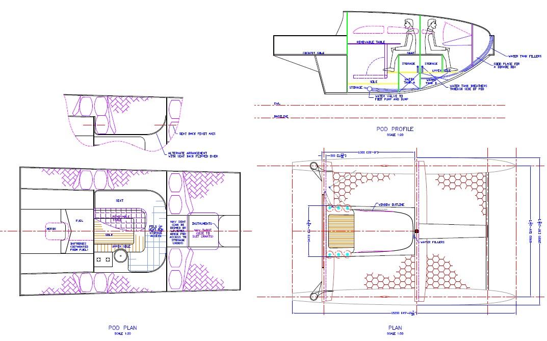 Vast deck space at 30 foot wide x 50 foot long, the unique central pod contains two queen berths and bathroom, sleeping up to 4 people. Full headroom plus plenty of storage - a very comfortable cruiser. An alternative interior plan is included. This has a chart table, small galley and salon table as well as 2 doubles and 4 single berths.
