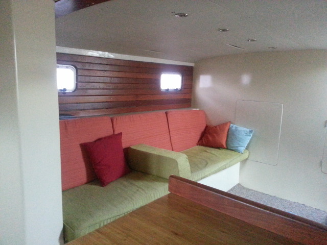 In the main section of the boat cabin, the entire port side is a large raised settee with table and bookshelves behind. On each side they are 3 opening port lights.