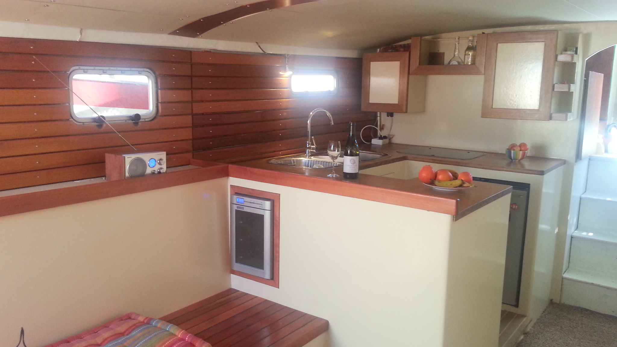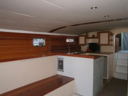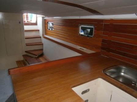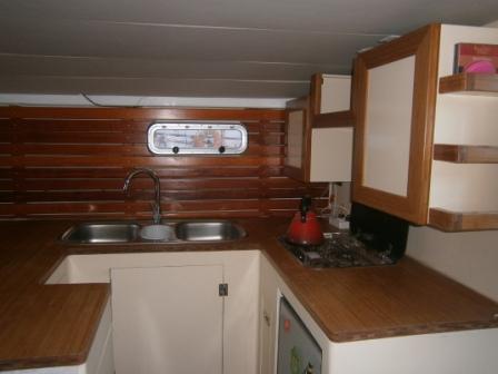 Down three steps aft of the pilothouse is the large wrap-around galley. This is equipped with a 3 burner gas stove, a 65l fridge, an all important wine cooler. There are 3 sinks to port.