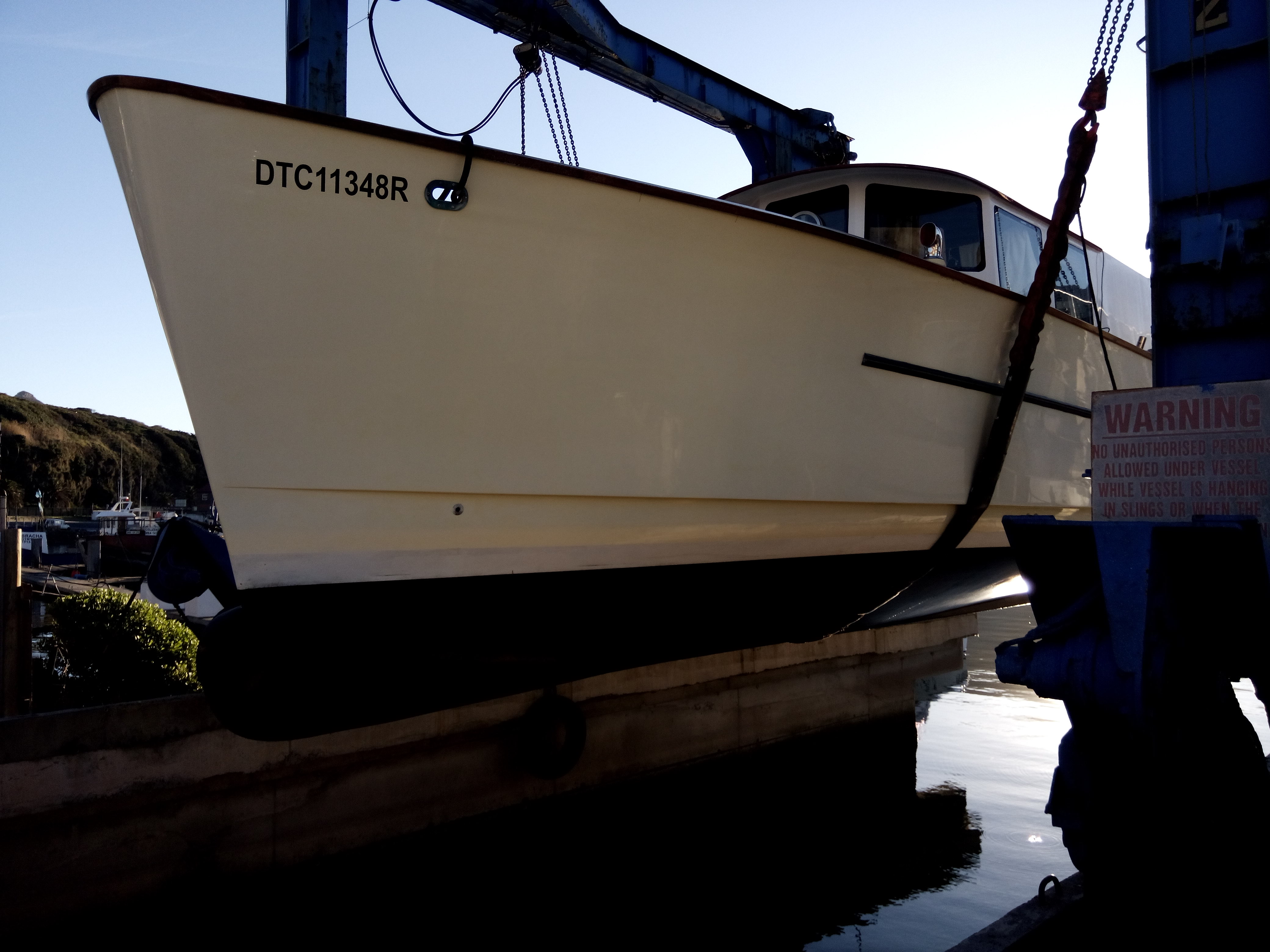 The boat deck is spacious enough to carry a 12′ hard boat on the centre line. It can be lifted on and off with the mast and boom forward.